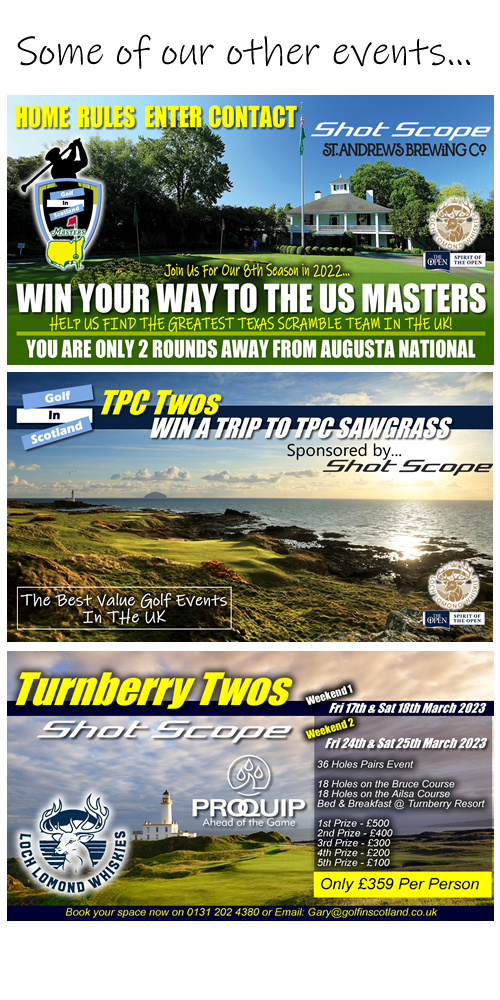 Entry is only £295 Per Person - £45 deposit per person to secure your entry. £125 payment due by November 30th 2022 £125 payment due by March 1st 2023 Golf in Scotland, who run the largest amateur golf tour in Europe, the greatest team golf event in the world (aside from the Ryder Cup), the best pairs events in the UK and the coolest seniors tour in Scotland, will be running the event from start to finish, so all players can expect to be very well looked after throughout the weekend. If you would like to enter, please contact us using the information below :)